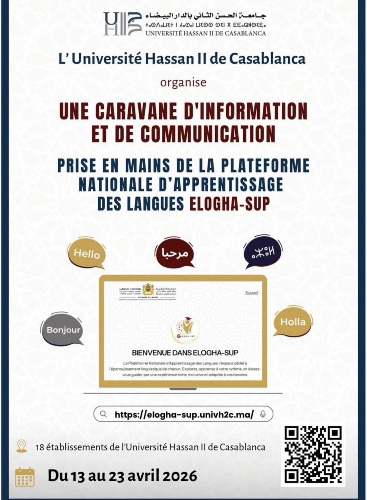 Une caravane d’information et de communication en relation avec la Plateforme ELOGHA-SUP aura lieu à la FSJES Ain Sebaa le Lundi 13 Avril 2026 de 12h à 13h30 au profit des étudiants du S4 et S6 à la salle polyvalente.