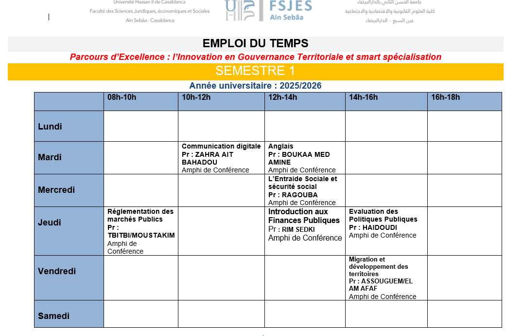 Emploi du temps du Master « Management et Gouvernance des Collectivités Territoriales-Semestre 1-2025/2026