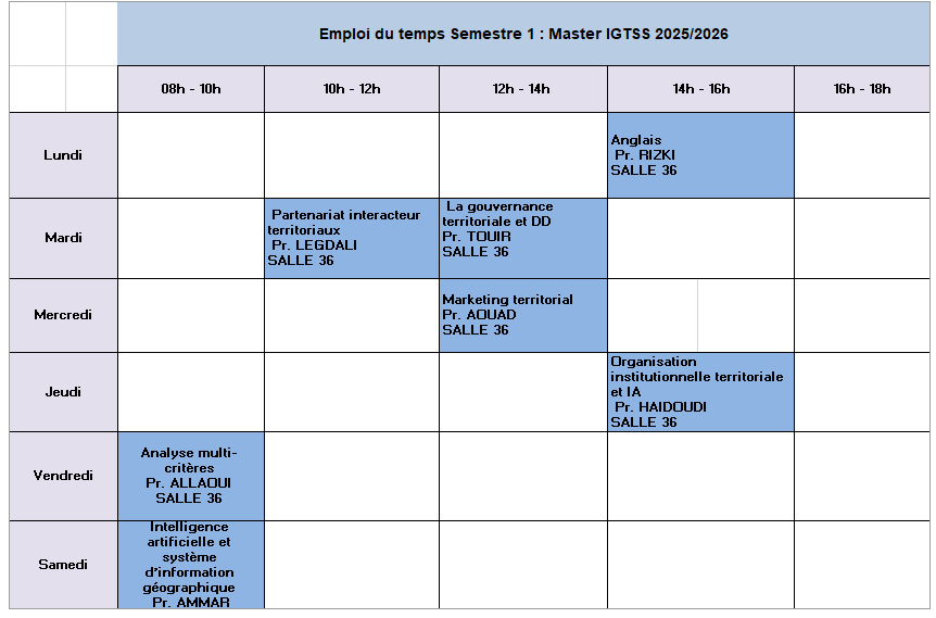 Emploi du temps du Master d’excellence « IGTSS »-Semestre 1-2025/2026
