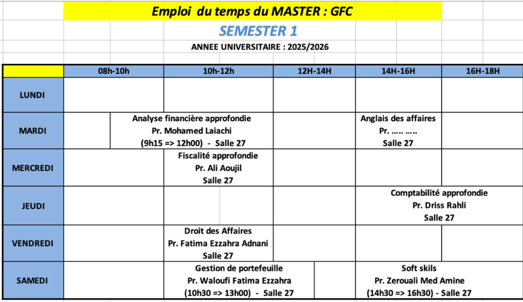 Emploi du temps du Master « Gestion Financière et Comptable « -Semestre 1-2025/2026