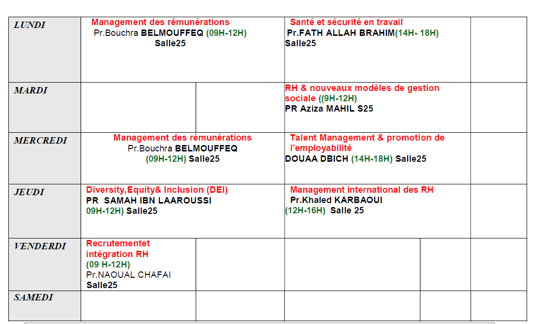 Emploi du temps du Master « Management des Ressources Humaines »-Semestre 1 – 2025/2026
