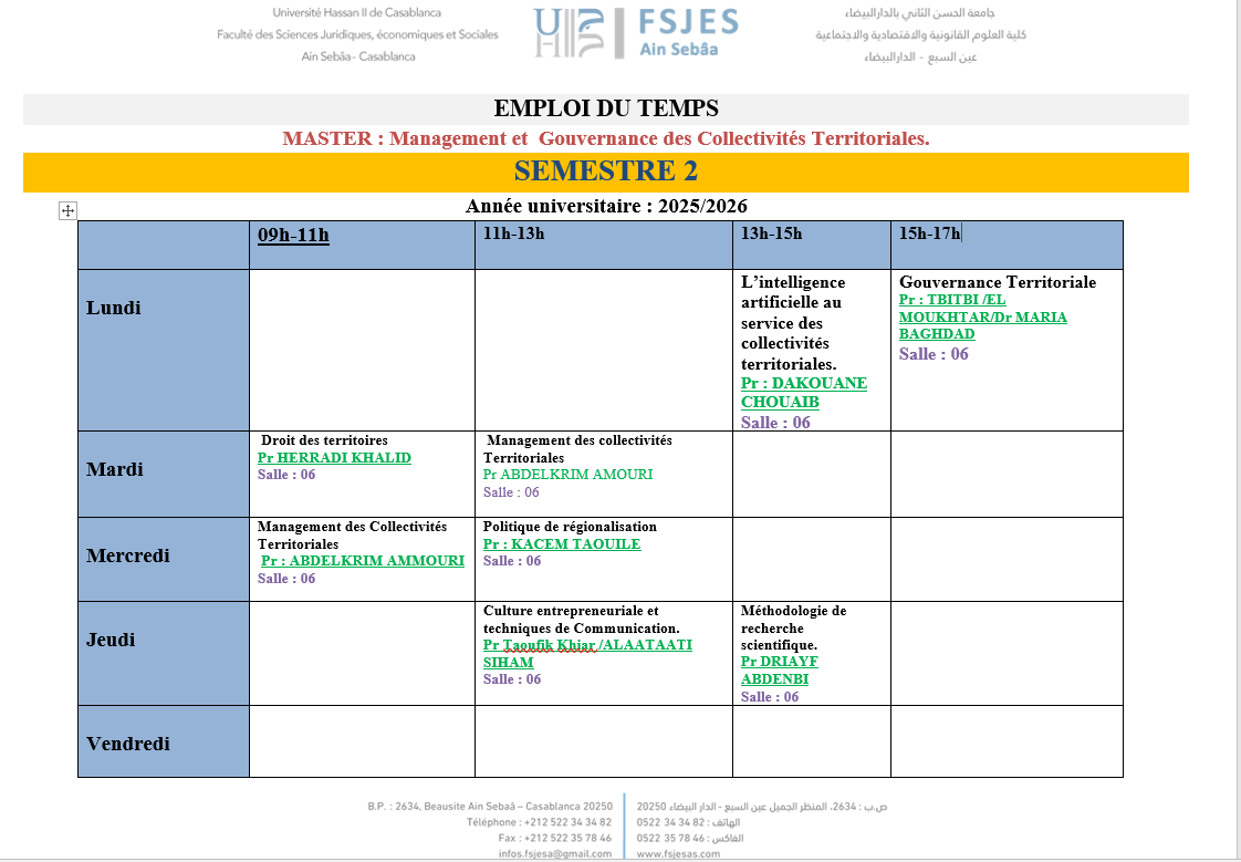 Emploi du temps : Management et Gouvernance des Collectivités Territoriales -Semestre 2
